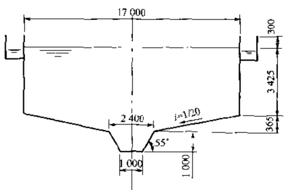 角形出水堰,三角形頂寬0.17m,堰頂之間的間距為0.10m,每個濃縮池有三角堰: