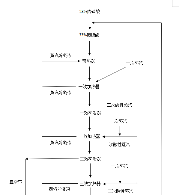 1、任務:將鈦白粉生產過程中產生的23%~28%的廢酸經三級加熱真空濃縮之后達到預定濃度后回收利用。