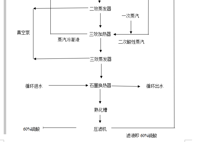 31%的廢硫酸經濃縮供料泵泵入臥式凝結水預熱器,經預熱器加熱之后的廢硫酸,進入一效循環泵前加入濃縮系統,混同循環酸一并在一效加熱器中同加熱蒸汽換熱、升溫進入一效蒸發器。在一效蒸發器中真空濃縮**要求濃度的酸在一效蒸發器中部經酸溢流管**二效循環泵前進入二效循環系統,混同循環酸一并在二效加熱器中同由一效蒸發產生的二次酸性蒸汽換熱、升溫進入二效蒸發器。在二效蒸發器中真空濃縮**要求濃度的酸在二效蒸發器中部經酸溢流管**三效循環泵前進入三效循環系統,混同循環酸一并進入三效加熱器中同由一效蒸發產生的二次酸性蒸汽換熱、升溫進入三效蒸發器。在三效蒸發器中真空濃縮**要求濃度的酸在三效蒸發器中部經酸溢流管溢流**濃酸熱酸貯槽中,其中未達要求濃度的酸經蒸發器底部進入循環泵,混同來酸繼續進行循環加熱蒸發。進入濃縮熱酸貯槽中的酸經泵打入石墨換熱器進行換熱冷卻,冷卻后的硫酸溢流**熟化槽進行三級熟化結晶。