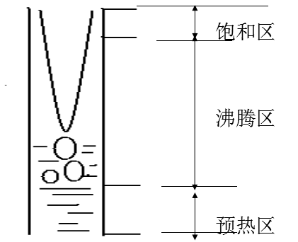 對于升膜式蒸發器,物料從管束下部引入。工作時,物料在加熱管內全程形成上、中、下三個不同區域,如圖所示,物料在下部,因液層靜壓作用,物料不沸騰,只起加熱作用。在中部溫度上升物料沸騰,二次蒸汽形成,蒸汽體積急速增大,管芯形成高速上升氣流將液體在管壁壓成薄膜向上流動,形成很好的傳熱條件,傳熱系數大大增加,使蒸發加快。到達上部后進入飽和區,汽液混合物經管頂進入汽液分離器進行汽液分離。而在降膜式蒸發器中,物料從頂部進入,然后呈膜狀蒸發。