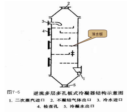 1、孔板式冷凝器:冷凝器是一個用鋼板制成的圓筒,直徑為400-2,000mm。高度為1,200—5,000mm。如圖所示,內裝有若干塊鉆有許多小孔的淋水板,淋水板為交替放置的圓缺型或交替放置的盤環型。冷卻水自上引入,經淋水板小孔穿流而下,同時也經板邊緣溢流而下,二次蒸汽自下而上與冷卻水逆流接觸,換熱冷凝?;旌系睦鋮s水和冷凝水由下部排出,不凝性氣體由上方排出。