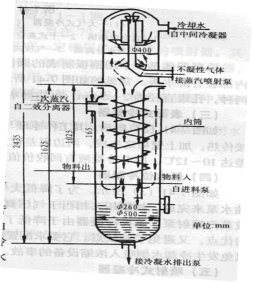 4)冷凝器和真空系統的改變。末效的二次蒸汽大多被冷凝器中的螺旋盤管內的物料冷凝,物料同時被預熱,所以稱為預熱器。剩余少部分二次蒸汽及不凝性氣體被水力噴射泵排出。由于使用水力噴射器使耗水量大大增加。目前常見的為混合式冷凝器與水環式真空泵配合使用。
