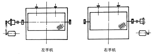 本機(jī)按傳動(dòng)部件設(shè)置的具體位置,分為兩種排列方式,面向出漿端看轉(zhuǎn)鼓,傳動(dòng)在右邊的為右手機(jī),用字母“Y”表示,傳動(dòng)在左邊的為左手機(jī),用字母“Z”表示,如下圖所示;