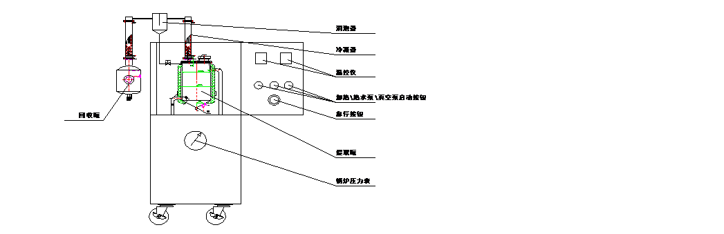本機(jī)組組成:微型提取罐、回流冷凝器、消泡器、回收冷凝器、回收罐、電控箱、水環(huán)真空泵以及以上各部件的連接管閥件、儀表等部分組成。