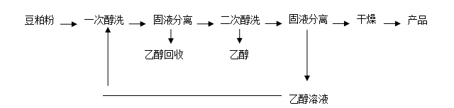 濃縮蛋白質的生產主要是以低溫脫脂豆粕為原料,通過不同的加工方法,除去低溫粕中的可溶性糖分、灰分以及其他可溶性的微量成分,從而使蛋白質的含量從45%-50%提高到70%左右。所采用的酒精洗滌法工藝原理是:一定濃度的酒精溶液,可使大豆蛋白質變性,失去可溶性。根據這一特性,利用含水酒精對豆粕中的非蛋白質可溶性物質進行浸出、洗滌,剩下的不溶物經脫溶、干燥即可獲得濃縮蛋白。醇法大豆濃縮蛋白的特點在于產品的風味、色澤好,蛋白質得率高,生產過程中無污水排放,避免了環境污染,且更有利于對產品進行綜合利用。